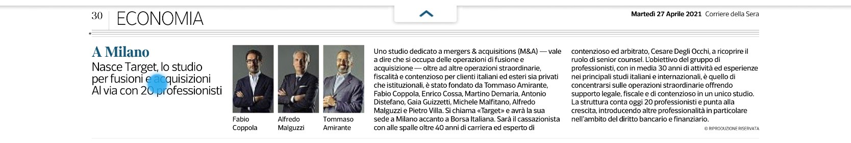 Corriere della Sera: Introducing TARGET, a law firm focused on M&A transactions.